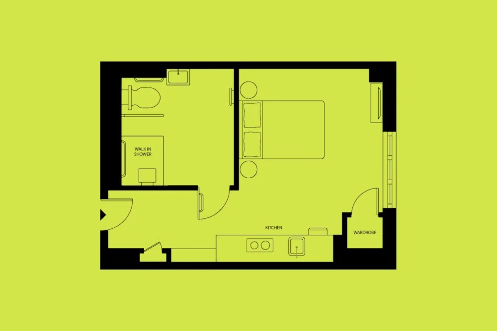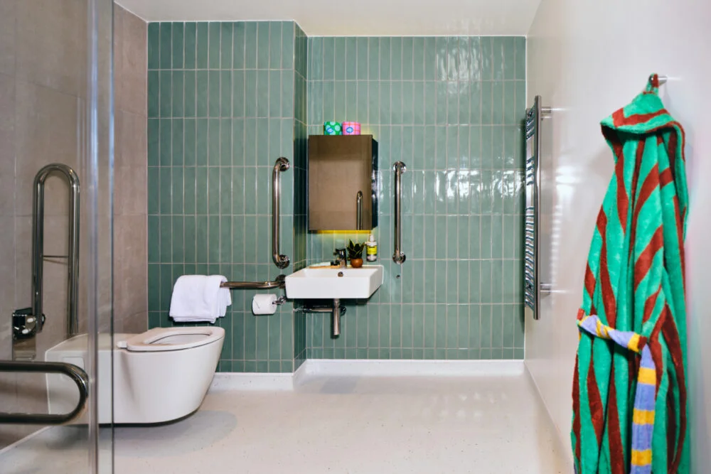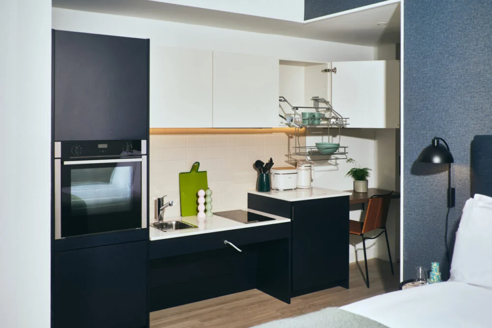 Each accessible apartment includes a kitchenette with a rise and fall wheel under counter and accessible appliances.