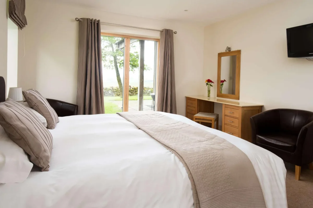The patio and garden areas offer level access for outdoor seating and dining, with wide open countryside views.