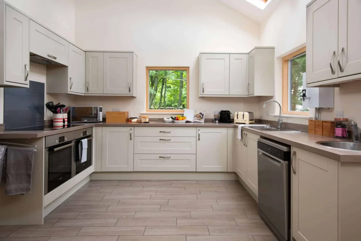 The kitchen is fully equipped with modern appliances and ample workspace. Clear routes between work surfaces, appliances, and the dining area allow practical use for guests with limited mobility.