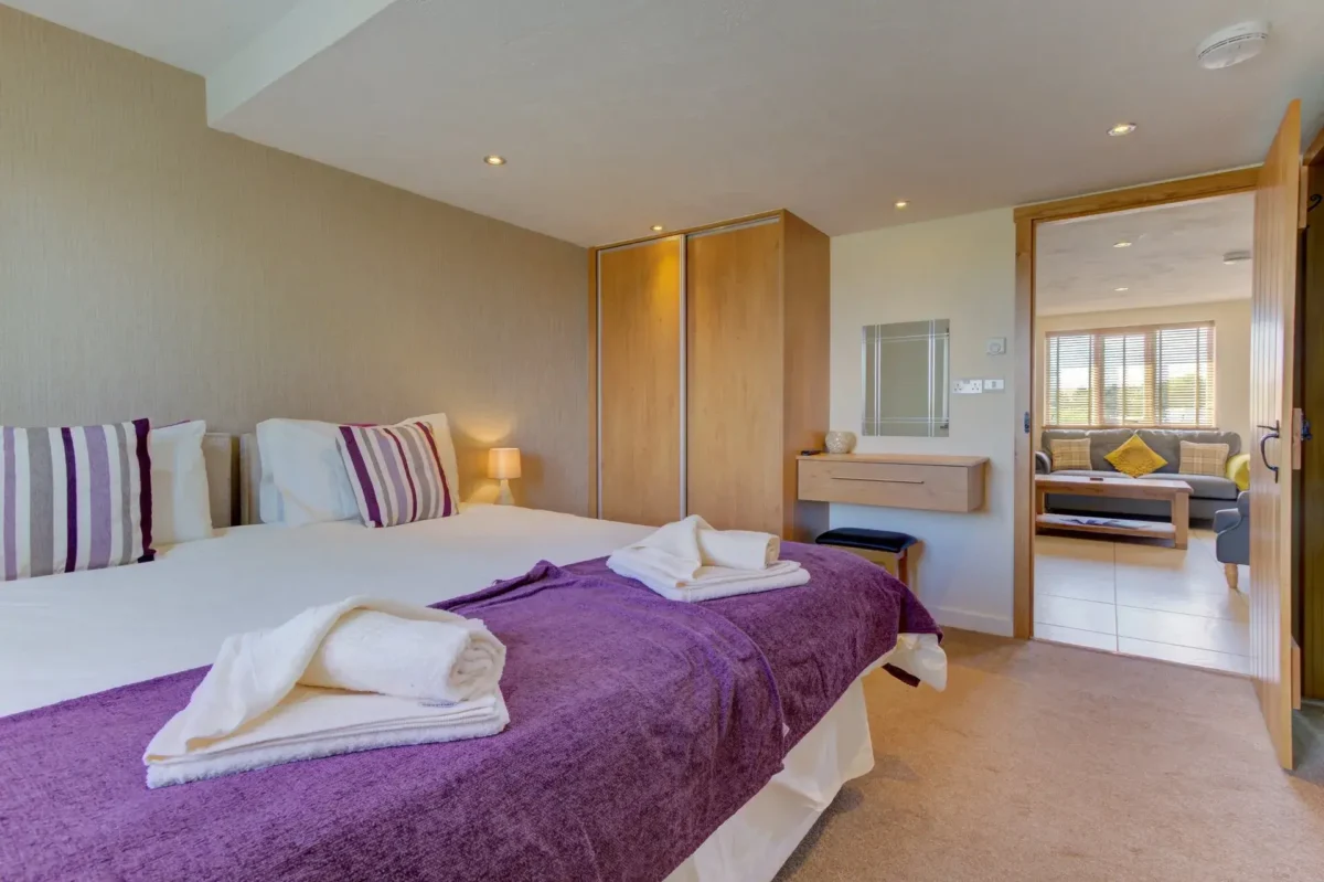A second ground floor bedroom offers a flexible twin or double bed arrangement with an en suite walk-in shower, suitable for guests who do not require hoist access.