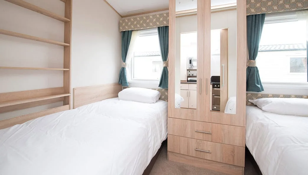 The second bedroom contains twin beds with space between them to allow easier movement. This bedroom is fully step free and suitable for guests with mobility needs or carers.