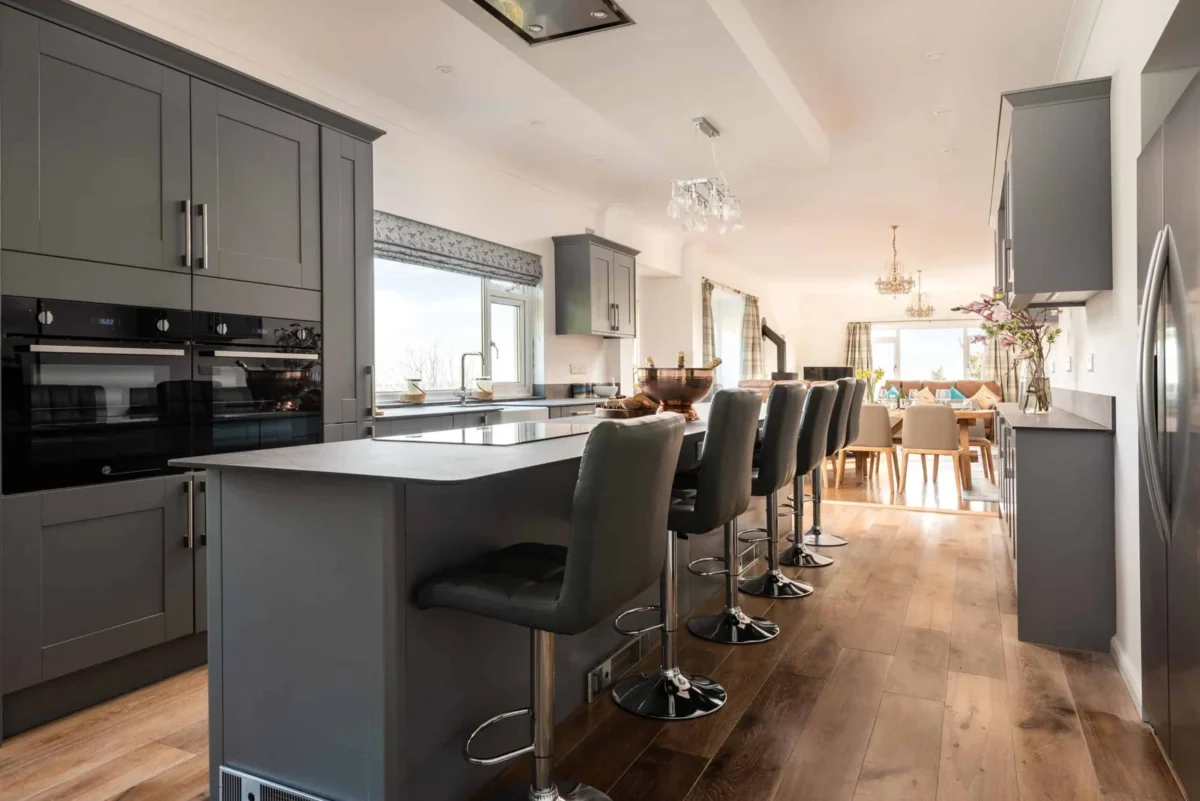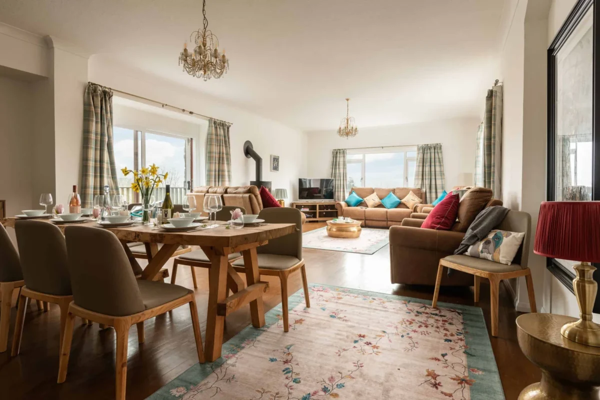 The main living, dining, and kitchen areas are open plan and spacious, offering good circulation space and comfortable seating arrangements.
