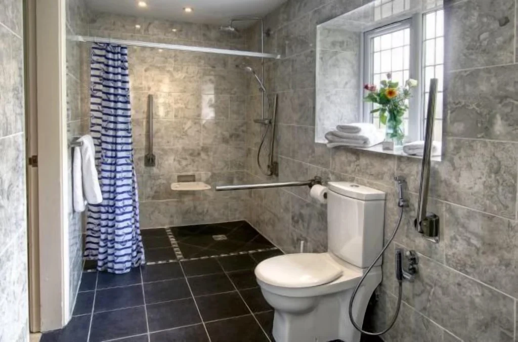 Accessible ensuite wet rooms include step free wheel in showers, handheld shower heads, fixed shower seating, supportive handrails, wheel under wash basins, and toilets with side transfer space.